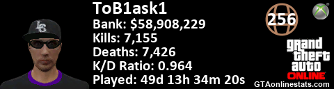 <a href="http://GTAonlinestats.com/showplayer/ToB1ask1"><img src="http://GTAonlinestats.com/signature/ToB1ask1/sig.png" alt="ToB1ask1" border="0" /></a>