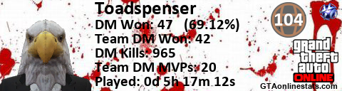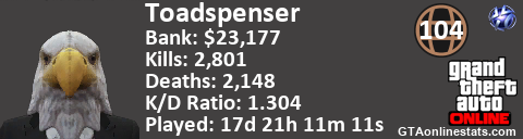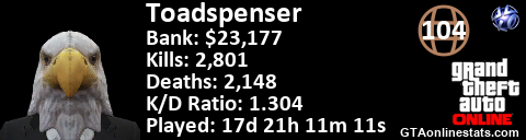 [URL=http://GTAonlinestats.com/showplayer/Toadspenser][IMG]http://GTAonlinestats.com/dmsignature/Toadspenser/sig.png[/IMG][/URL]