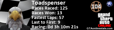[URL=http://GTAonlinestats.com/showplayer/Toadspenser][IMG]http://GTAonlinestats.com/racesignature/Toadspenser/sig.png[/IMG][/URL]
