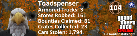 [URL=http://GTAonlinestats.com/showplayer/Toadspenser][IMG]http://GTAonlinestats.com/signature/Toadspenser/sig.png[/IMG][/URL]