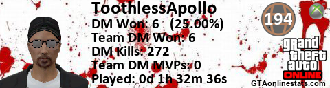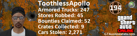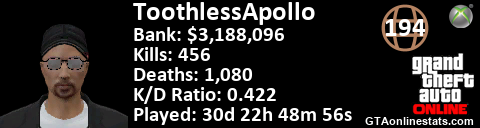 [URL=http://GTAonlinestats.com/showplayer/ToothlessApollo][IMG]http://GTAonlinestats.com/signature/ToothlessApollo/sig.png[/IMG][/URL]
