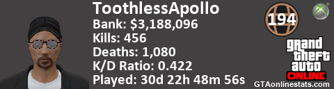 <a href="http://GTAonlinestats.com/showplayer/ToothlessApollo"><img src="http://GTAonlinestats.com/signature/ToothlessApollo/sig.png" alt="ToothlessApollo" border="0" /></a>