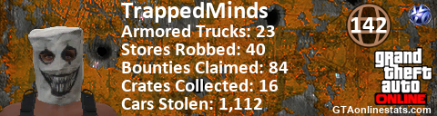 <a href="http://GTAonlinestats.com/showplayer/TrappedMinds"><img src="http://GTAonlinestats.com/crimesignature/TrappedMinds/sig.png" alt="TrappedMinds" border="0" /></a>