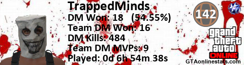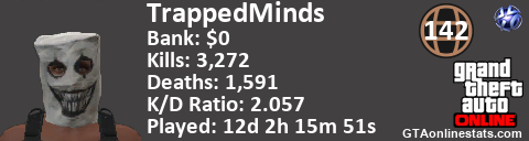 [URL=http://GTAonlinestats.com/showplayer/TrappedMinds][IMG]http://GTAonlinestats.com/dmsignature/TrappedMinds/sig.png[/IMG][/URL]