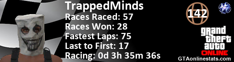 <a href="http://GTAonlinestats.com/showplayer/TrappedMinds"><img src="http://GTAonlinestats.com/racesignature/TrappedMinds/sig.png" alt="TrappedMinds" border="0" /></a>