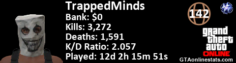 <a href="http://GTAonlinestats.com/showplayer/TrappedMinds"><img src="http://GTAonlinestats.com/dmsignature/TrappedMinds/sig.png" alt="TrappedMinds" border="0" /></a>