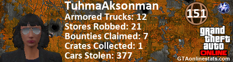 [URL=http://GTAonlinestats.com/showplayer/TuhmaAksonman/2][IMG]http://GTAonlinestats.com/crimesignature/TuhmaAksonman/2/sig.png[/IMG][/URL]