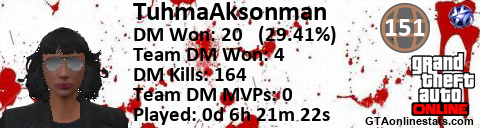 [URL=http://GTAonlinestats.com/showplayer/TuhmaAksonman/2][IMG]http://GTAonlinestats.com/dmsignature/TuhmaAksonman/2/sig.png[/IMG][/URL]