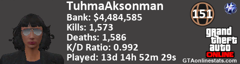 [URL=http://GTAonlinestats.com/showplayer/TuhmaAksonman/2][IMG]http://GTAonlinestats.com/randomsignature/TuhmaAksonman/2/sig.png[/IMG][/URL]