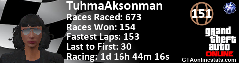 <a href="http://GTAonlinestats.com/showplayer/TuhmaAksonman/2"><img src="http://GTAonlinestats.com/racesignature/TuhmaAksonman/2/sig.png" alt="TuhmaAksonman" border="0" /></a>