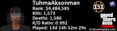 [URL=http://GTAonlinestats.com/showplayer/TuhmaAksonman/2][IMG]http://GTAonlinestats.com/signature/TuhmaAksonman/2/sig.png[/IMG][/URL]