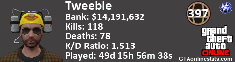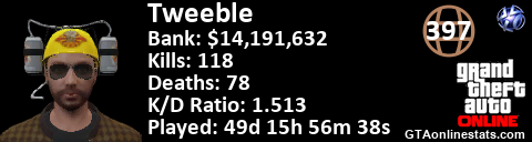 <a href="http://GTAonlinestats.com/showplayer/Tweeble"><img src="http://GTAonlinestats.com/greysignature/Tweeble/sig.png" alt="Tweeble" border="0" /></a>