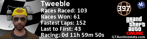 [URL=http://GTAonlinestats.com/showplayer/Tweeble][IMG]http://GTAonlinestats.com/racesignature/Tweeble/sig.png[/IMG][/URL]