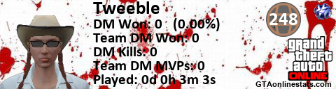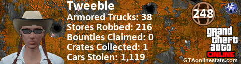 [URL=http://GTAonlinestats.com/showplayer/Tweeble/2][IMG]http://GTAonlinestats.com/greysignature/Tweeble/2/sig.png[/IMG][/URL]