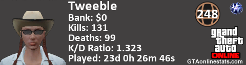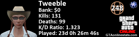 <a href="http://GTAonlinestats.com/showplayer/Tweeble/2"><img src="http://GTAonlinestats.com/signature/Tweeble/2/sig.png" alt="Tweeble" border="0" /></a>