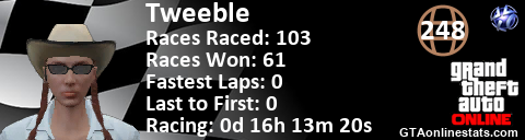 [URL=http://GTAonlinestats.com/showplayer/Tweeble/2][IMG]http://GTAonlinestats.com/racesignature/Tweeble/2/sig.png[/IMG][/URL]