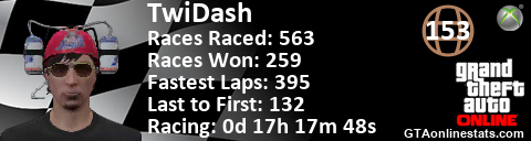 <a href="http://GTAonlinestats.com/showplayer/TwiDash"><img src="http://GTAonlinestats.com/racesignature/TwiDash/sig.png" alt="TwiDash" border="0" /></a>