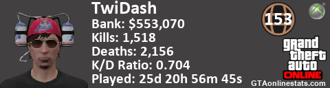 <a href="http://GTAonlinestats.com/showplayer/TwiDash"><img src="http://GTAonlinestats.com/dmsignature/TwiDash/sig.png" alt="TwiDash" border="0" /></a>