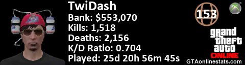 <a href="http://GTAonlinestats.com/showplayer/TwiDash"><img src="http://GTAonlinestats.com/randomsignature/TwiDash/sig.png" alt="TwiDash" border="0" /></a>