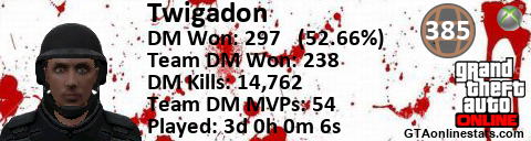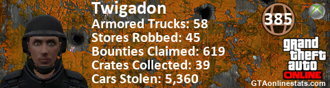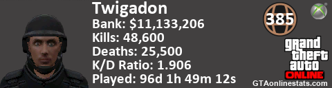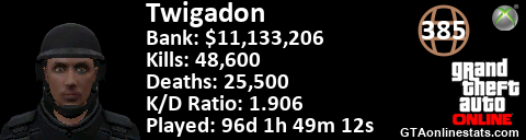 [URL=http://GTAonlinestats.com/showplayer/Twigadon][IMG]http://GTAonlinestats.com/signature/Twigadon/sig.png[/IMG][/URL]