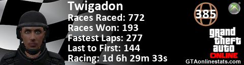 [URL=http://GTAonlinestats.com/showplayer/Twigadon][IMG]http://GTAonlinestats.com/racesignature/Twigadon/sig.png[/IMG][/URL]