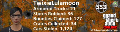 [URL=http://GTAonlinestats.com/showplayer/TwixieLulamoon][IMG]http://GTAonlinestats.com/crimesignature/TwixieLulamoon/sig.png[/IMG][/URL]