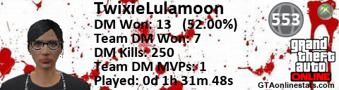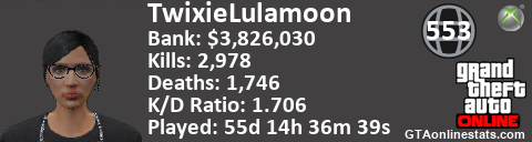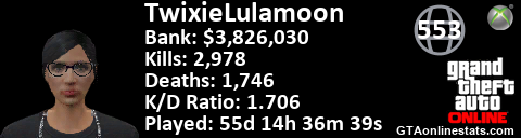 [URL=http://GTAonlinestats.com/showplayer/TwixieLulamoon][IMG]http://GTAonlinestats.com/signature/TwixieLulamoon/sig.png[/IMG][/URL]
