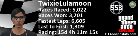 [URL=http://GTAonlinestats.com/showplayer/TwixieLulamoon][IMG]http://GTAonlinestats.com/racesignature/TwixieLulamoon/sig.png[/IMG][/URL]