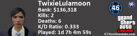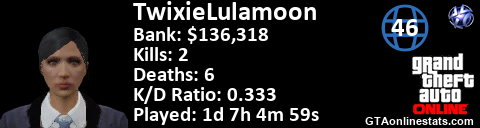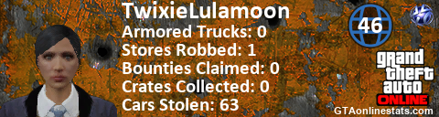 [URL=http://GTAonlinestats.com/showplayer/TwixieLulamoon/2][IMG]http://GTAonlinestats.com/signature/TwixieLulamoon/2/sig.png[/IMG][/URL]