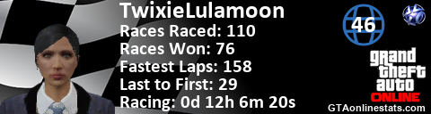 [URL=http://GTAonlinestats.com/showplayer/TwixieLulamoon/2][IMG]http://GTAonlinestats.com/racesignature/TwixieLulamoon/2/sig.png[/IMG][/URL]