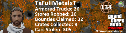 <a href="http://GTAonlinestats.com/showplayer/TxFullMetalxT"><img src="http://GTAonlinestats.com/crimesignature/TxFullMetalxT/sig.png" alt="TxFullMetalxT" border="0" /></a>