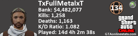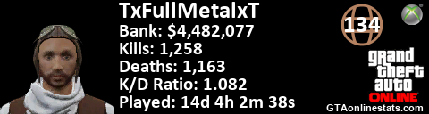 [URL=http://GTAonlinestats.com/showplayer/TxFullMetalxT][IMG]http://GTAonlinestats.com/dmsignature/TxFullMetalxT/sig.png[/IMG][/URL]
