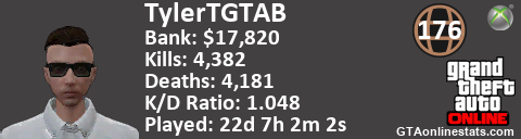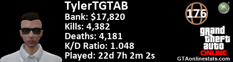 [URL=http://GTAonlinestats.com/showplayer/TylerTGTAB][IMG]http://GTAonlinestats.com/greysignature/TylerTGTAB/sig.png[/IMG][/URL]