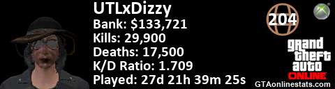 [URL=http://GTAonlinestats.com/showplayer/UTLxDizzy/2][IMG]http://GTAonlinestats.com/signature/UTLxDizzy/2/sig.png[/IMG][/URL]