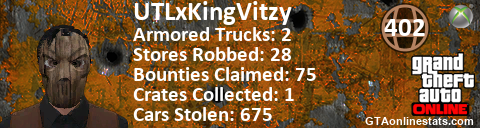 [URL=http://GTAonlinestats.com/showplayer/UTLxKingVitzy][IMG]http://GTAonlinestats.com/randomsignature/UTLxKingVitzy/sig.png[/IMG][/URL]