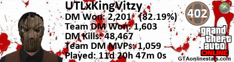 [URL=http://GTAonlinestats.com/showplayer/UTLxKingVitzy][IMG]http://GTAonlinestats.com/signature/UTLxKingVitzy/sig.png[/IMG][/URL]