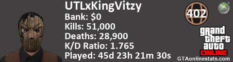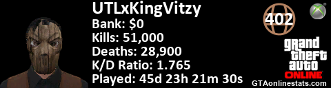 <a href="http://GTAonlinestats.com/showplayer/UTLxKingVitzy"><img src="http://GTAonlinestats.com/signature/UTLxKingVitzy/sig.png" alt="UTLxKingVitzy" border="0" /></a>