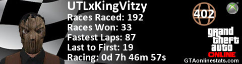 <a href="http://GTAonlinestats.com/showplayer/UTLxKingVitzy"><img src="http://GTAonlinestats.com/racesignature/UTLxKingVitzy/sig.png" alt="UTLxKingVitzy" border="0" /></a>