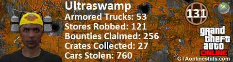 [URL=http://GTAonlinestats.com/showplayer/Ultraswamp][IMG]http://GTAonlinestats.com/randomsignature/Ultraswamp/sig.png[/IMG][/URL]