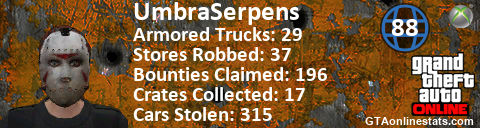 [URL=http://GTAonlinestats.com/showplayer/UmbraSerpens][IMG]http://GTAonlinestats.com/crimesignature/UmbraSerpens/sig.png[/IMG][/URL]