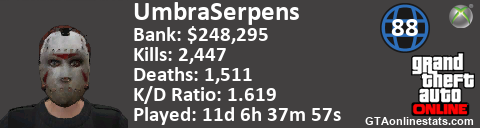 <a href="http://GTAonlinestats.com/showplayer/UmbraSerpens"><img src="http://GTAonlinestats.com/signature/UmbraSerpens/sig.png" alt="UmbraSerpens" border="0" /></a>