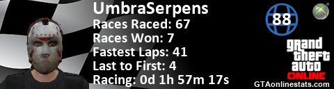 [URL=http://GTAonlinestats.com/showplayer/UmbraSerpens][IMG]http://GTAonlinestats.com/racesignature/UmbraSerpens/sig.png[/IMG][/URL]
