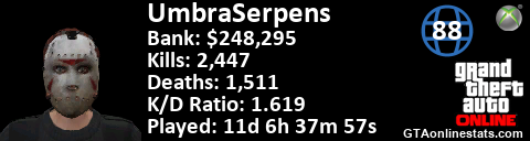 <a href="http://GTAonlinestats.com/showplayer/UmbraSerpens"><img src="http://GTAonlinestats.com/dmsignature/UmbraSerpens/sig.png" alt="UmbraSerpens" border="0" /></a>