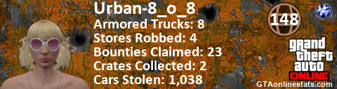 [URL=http://GTAonlinestats.com/showplayer/Urban-8_o_8][IMG]http://GTAonlinestats.com/randomsignature/Urban-8_o_8/sig.png[/IMG][/URL]