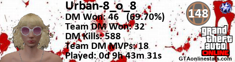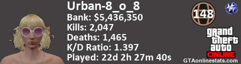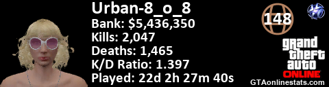 [URL=http://GTAonlinestats.com/showplayer/Urban-8_o_8][IMG]http://GTAonlinestats.com/dmsignature/Urban-8_o_8/sig.png[/IMG][/URL]