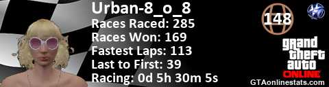 [URL=http://GTAonlinestats.com/showplayer/Urban-8_o_8][IMG]http://GTAonlinestats.com/racesignature/Urban-8_o_8/sig.png[/IMG][/URL]