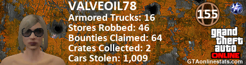[URL=http://GTAonlinestats.com/showplayer/VALVEOIL78][IMG]http://GTAonlinestats.com/signature/VALVEOIL78/sig.png[/IMG][/URL]
