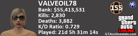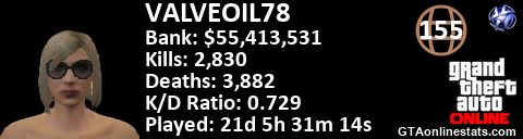 <a href="http://GTAonlinestats.com/showplayer/VALVEOIL78"><img src="http://GTAonlinestats.com/signature/VALVEOIL78/sig.png" alt="VALVEOIL78" border="0" /></a>