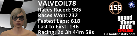 <a href="http://GTAonlinestats.com/showplayer/VALVEOIL78"><img src="http://GTAonlinestats.com/racesignature/VALVEOIL78/sig.png" alt="VALVEOIL78" border="0" /></a>