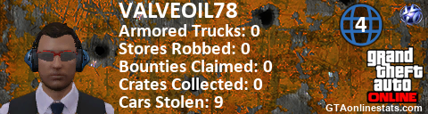 [URL=http://GTAonlinestats.com/showplayer/VALVEOIL78/2][IMG]http://GTAonlinestats.com/crimesignature/VALVEOIL78/2/sig.png[/IMG][/URL]